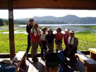 夜行バスのためあまり眠れなかったと言われていましたが、全員元気に鳩待峠からそれぞれ予定の尾瀬ヶ原と三条の滝コース、至仏山登山コースに分かれて出発。快適に至仏山山頂に着き下山開始まもなく雷が聞こえ始める、足場が悪くカミナリと雨の中転倒に注意しながら下る。山の鼻休憩所に先に到着した先頭グループはあまり濡れなかったが、後グループは雷雨の中の下山となった。約1時間山の鼻休憩所で待機して雨が上がるのを待つ、雨あがりの尾瀬ヶ原を縦断して全員16時温泉小屋に着き温泉入浴