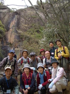 落ヶ滝から沢沿いではちょっとした岩登りも楽しめましたね。岩と岩の間を抜けて尾根道を進むと展望が開け、琵琶湖や大津方面まで見渡せてホッと一息。前方にはひときわ目立つ天狗岩があり、山にはこぶしやあせびの花が白く彩り、いい景色でした。竜王山に登り、その後は狛坂磨崖仏や逆さ観音などの石仏を見て楽しい山歩きを終えました。参加された皆さん、お疲れ様でした。