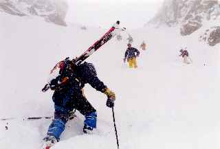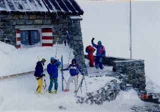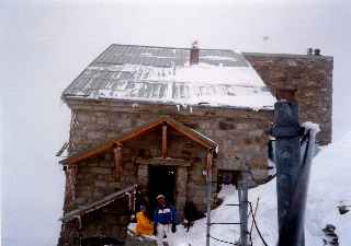 ロープウェーで3,233m終点。アルゼンチュール氷河へ滑り込む。ポーター(ガイドの卵)が転倒、ケガをし、シャモニへ下山。2,800m付近でメンバーの1人が足の不調のため、ガイドに付き添われて下山(後日、足首骨折と判明)。氷河の真中でシール、クトーを装着、シャルドンネのコルへ。コルからの下りはザイルをフィックスし横滑りで40m下降。3、000m付近でシールを付けサレイナの窓へ。最後はルンゼの中をツボ足で窓へ登る。ガスと雪で何も見えない。雪原の中をとトリエン小屋へ向かう。