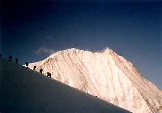 ヘッドランプをつけて小屋を出発。シールを付けたままモンコロン氷河へ滑り込む。最低部よりレベックのコルへ登り返す。コルからの下りはウインドクラストのアイスバーン。バタつくスキーを押さえながらアローラ氷河、目の前にブクタン