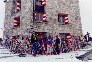 初めての快晴の中は小屋発。素晴らしい山々を見ながらセルバンテスのコルへ。上部はアイスバーンの急斜面で慎重にキックターンしながら登る。目の前にコース中の最高峰 、ピンダローラからの下りはウインドクラストした斜面。表面は波打ち、スキーは30-40cmもぐる。途中からガスとなりガイドのシュプールをたどるのみ。西穂の稜線のような岩と雪のミックスしたヤセ尾根を滑り込んでビニエット小屋。