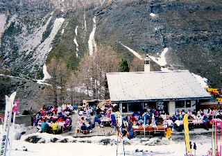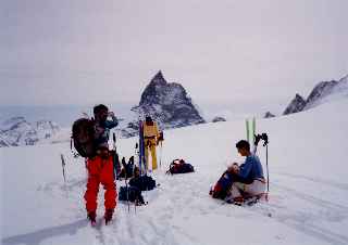 無人小屋(2,980m)。シールを再度つけモンブリエのコルへの登り。コルから大斜面でツアン氷河。ここからコース最後の登りにかかる。パルブリンのコルに到達すると目の前にマッターホーン。最終日に天候が良かったことを感謝。シュターフェアルプスキー場では、食事中のスキーヤーの拍手の出迎えにあう。フーリーからゴンドラに乗りツェルマットに下山。