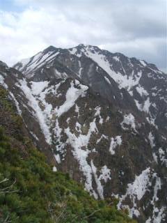 六百山山頂手前の稜線より霞沢岳を望む。