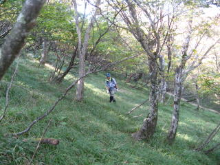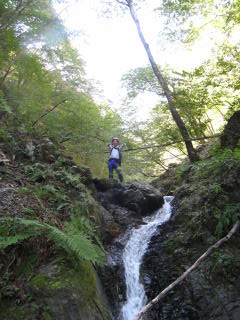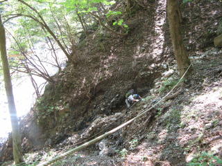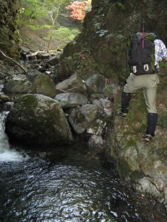 右岸の脆い壁に取付き三筋滝を巻く フィックスロープあり |