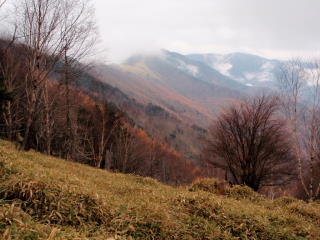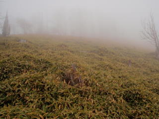 13コルから。中央の笹原の上、ガスがかかっている山が入山 |